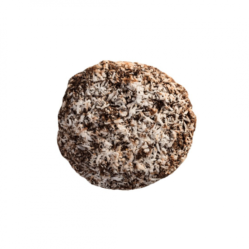 INGREDIENTS: Farina d'ESPELTA* (30%), cobertura de xocolata* (25%) (cacau, sucre de canya, mantega de cacau i vainilla), MANTEGA*, coco rallat* (14%), sucre integral de canya* i OU pasteuritzat*. POT CONTENIR: FRUITS SECS/